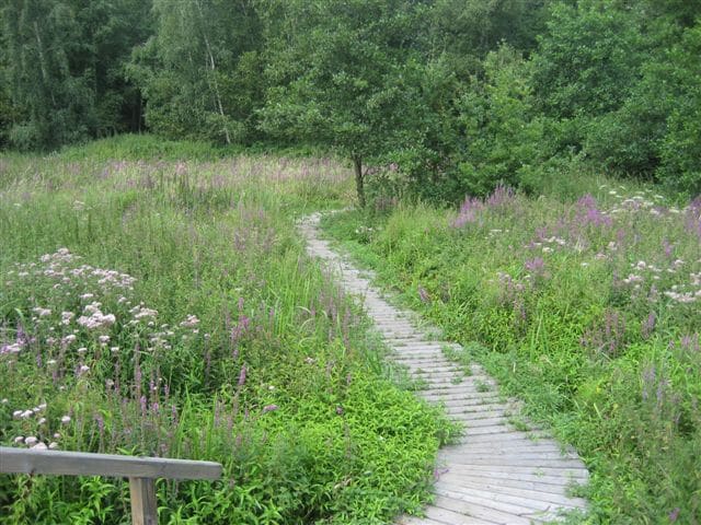 Wandelpad met houten loopbruggetjes door uniek natuurreservaat.